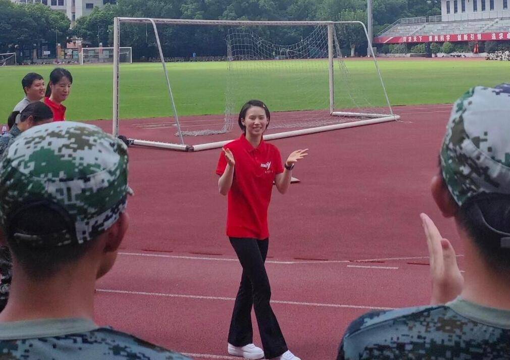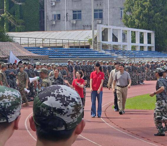 陈芋汐穿了一件红色T恤亮相,手上戴了一只手表还有一条手链,穿了黑色长裤和白色运动鞋。陈芋汐在路上被同济大学的学生们认了出来,有不少人高喊陈芋汐打招呼,陈芋汐微笑着挥手回应。老师还特意带着陈芋汐来到田径场,与正在军训的新生们打招呼。